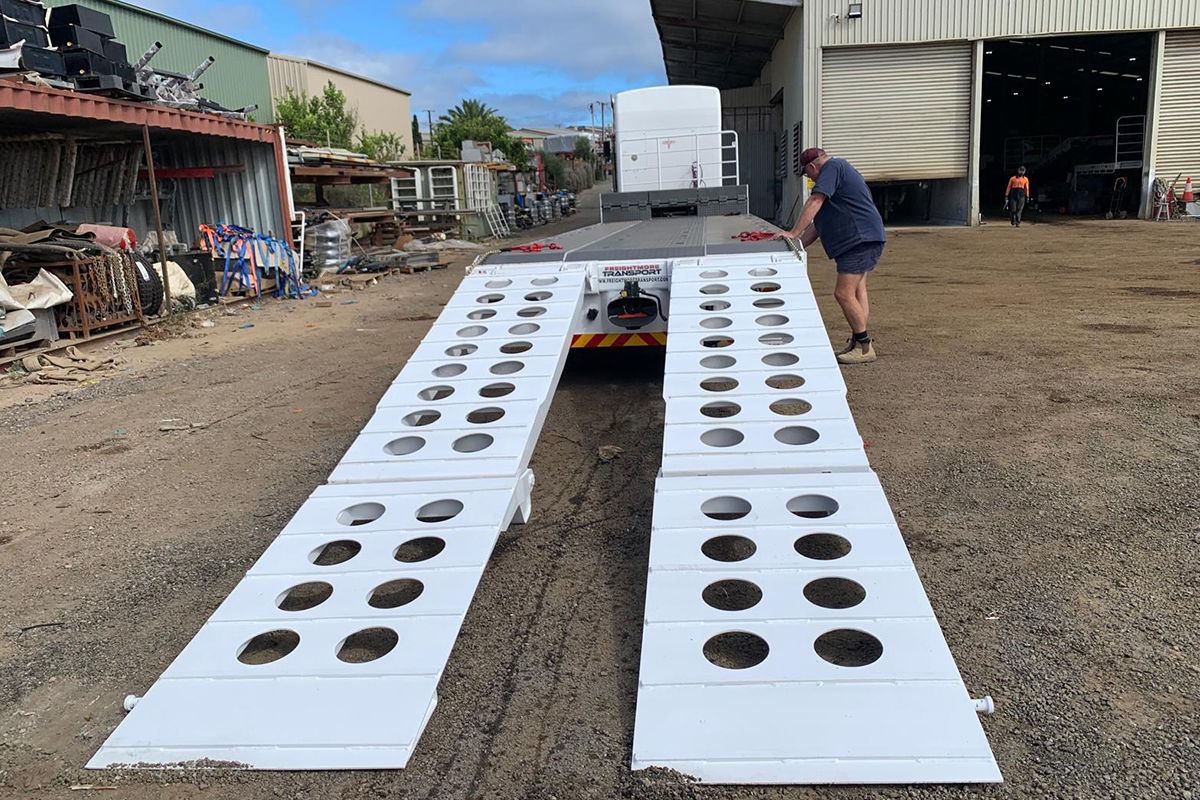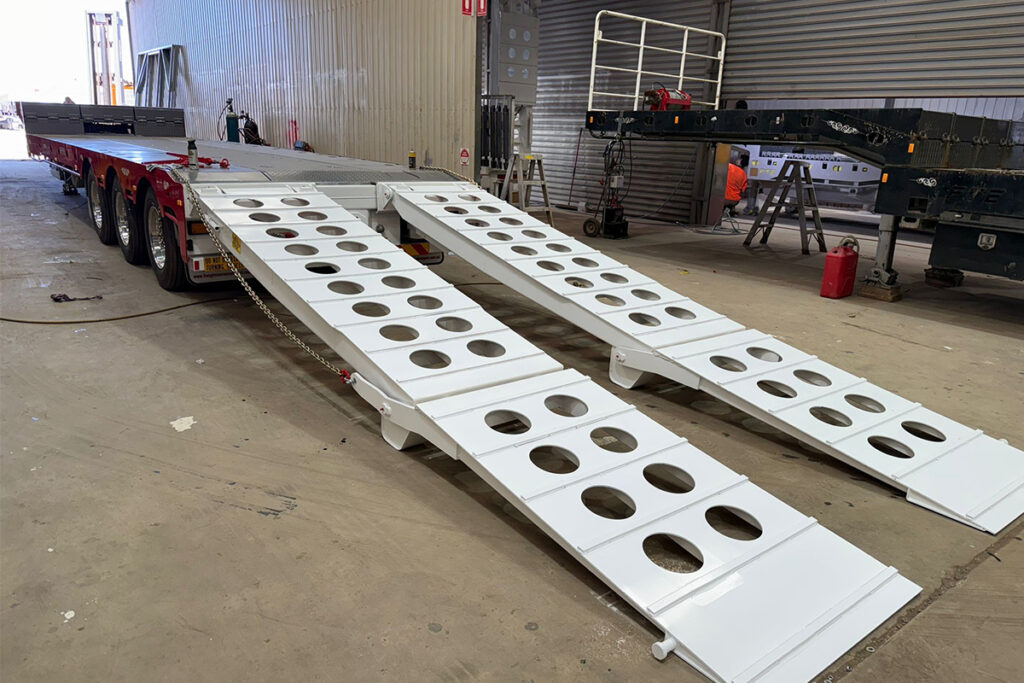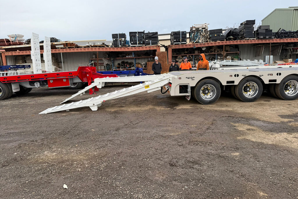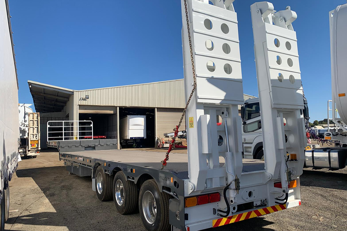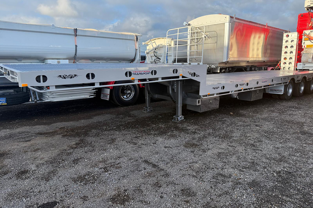 Premium 45ft Drop Deck OUTRIGGERS with Forward Folding Bi-Fold Ramps