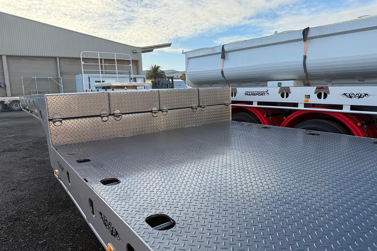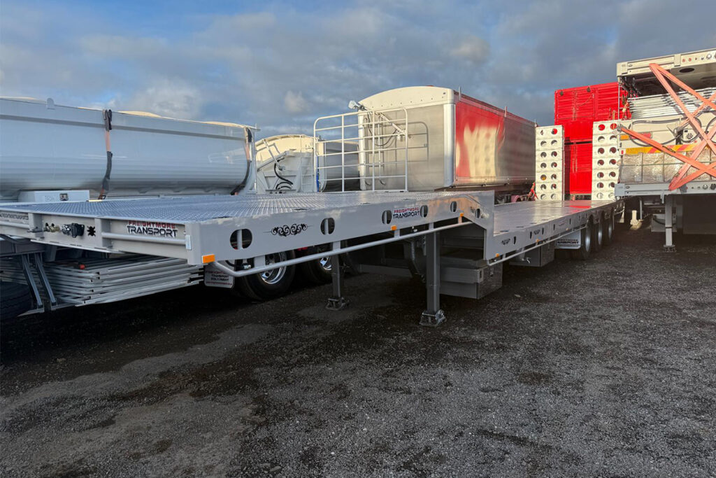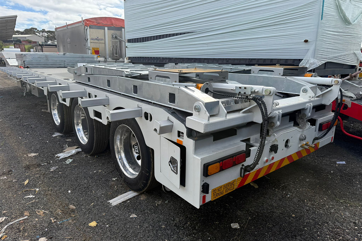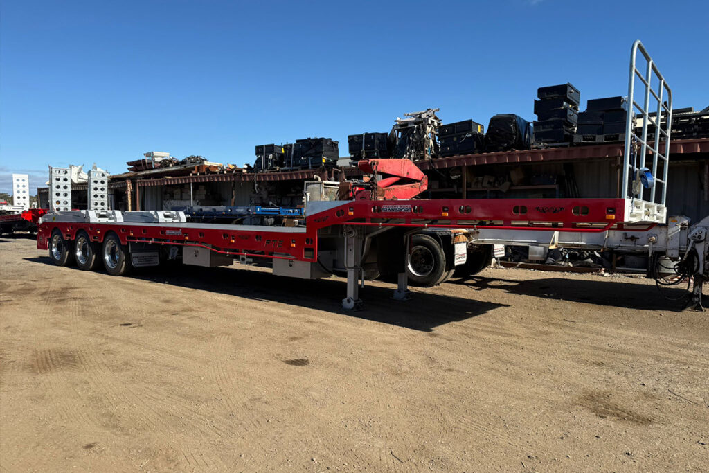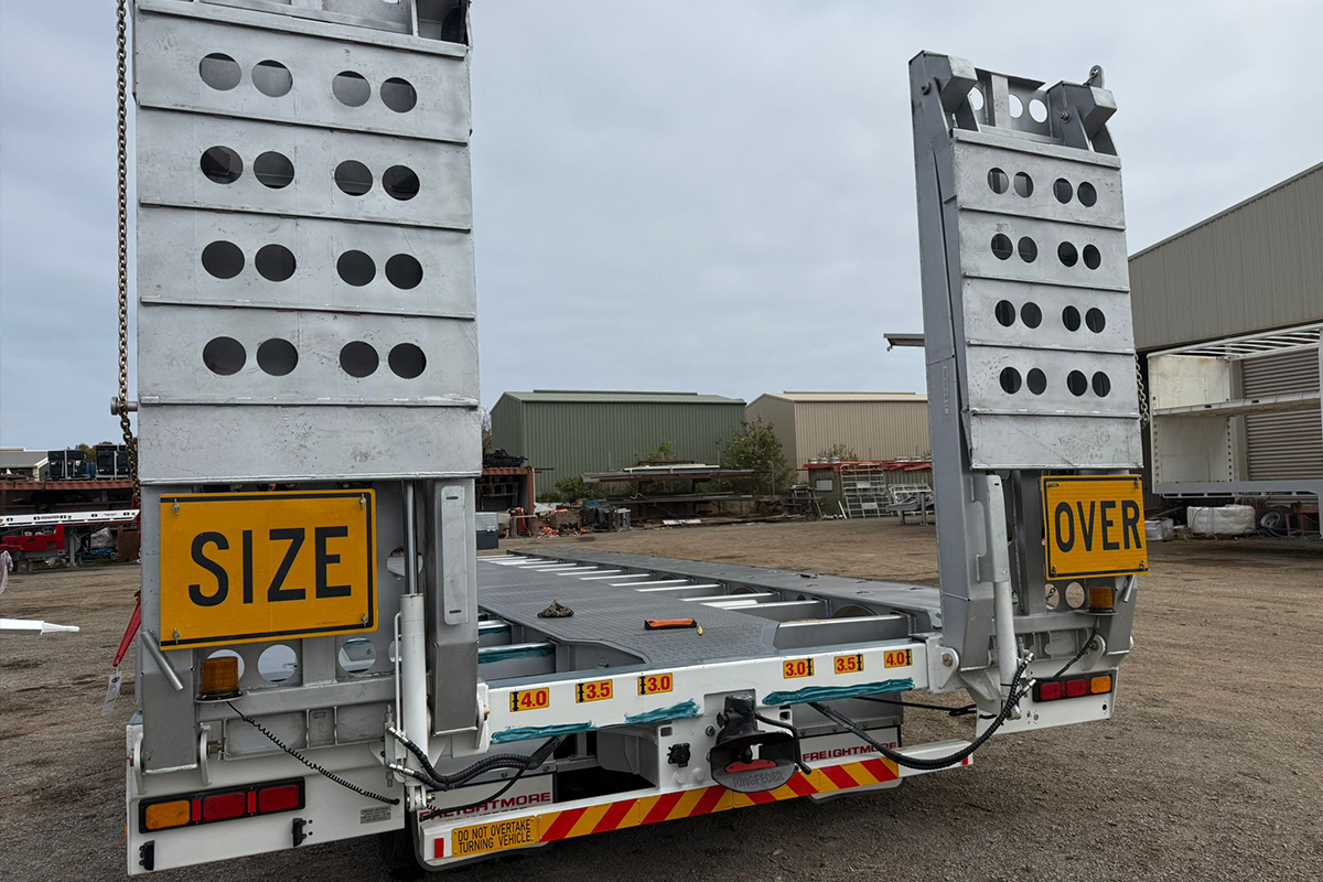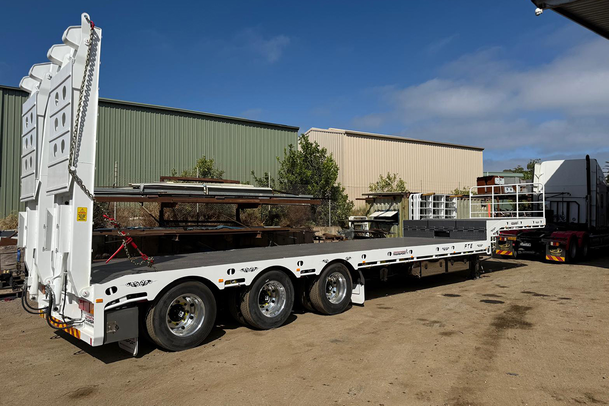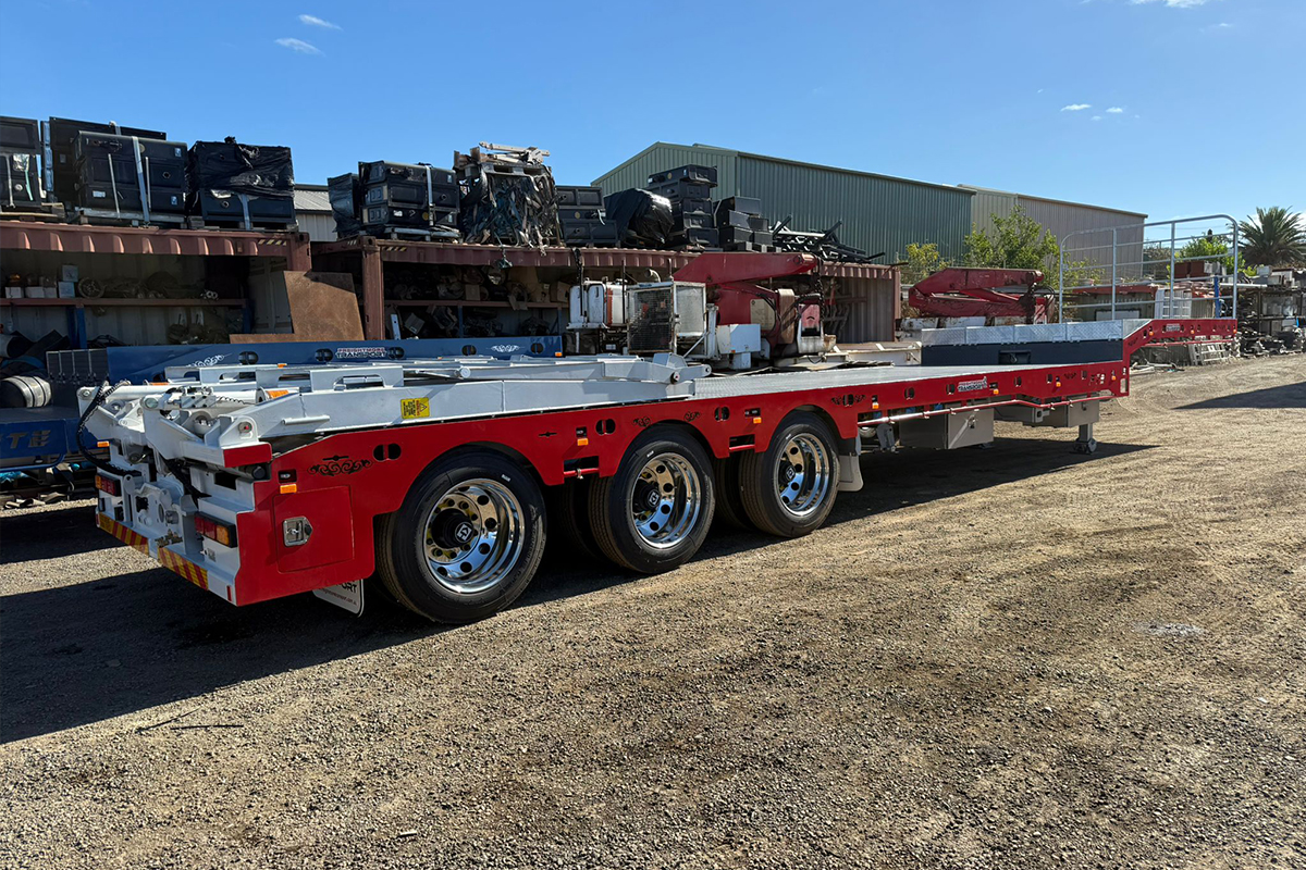 Heavy Duty, 3.5 m Hydraulic Widener , 3-way twist lock & container pins, 2 Toolboxes , Flip over Top deck Ramps, Gate Pockets, Alloy wheels , 20,000LBS Hydraulic Winch, Bi-Fold Ramps with single Beacon, Road Train Bracket, Airbag Suspension, K-Hitch Axles & K-Hitch Suspension, JOST or K-Hitch Landing Legs, EBS/ABS brakes, PBS compatible.