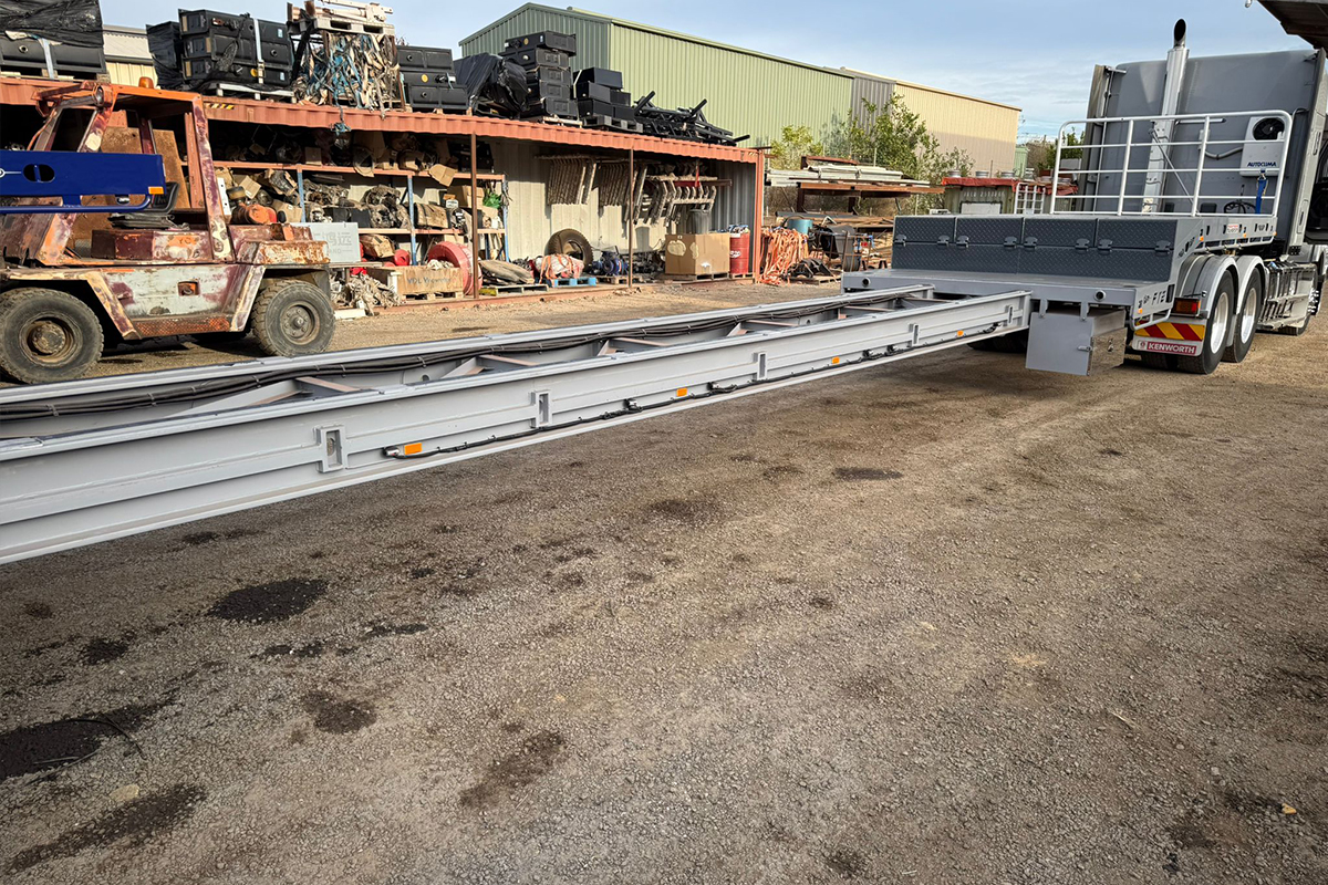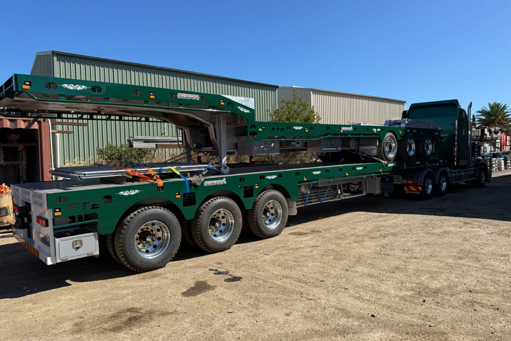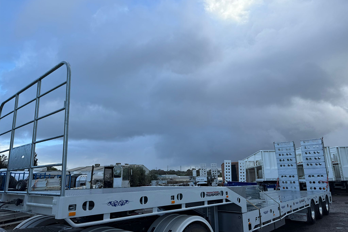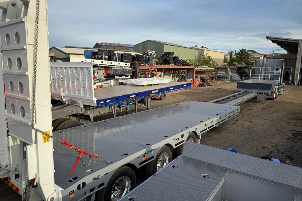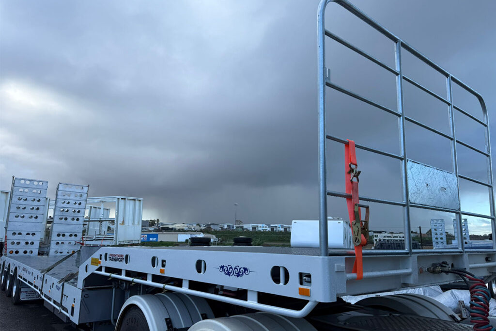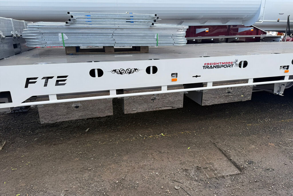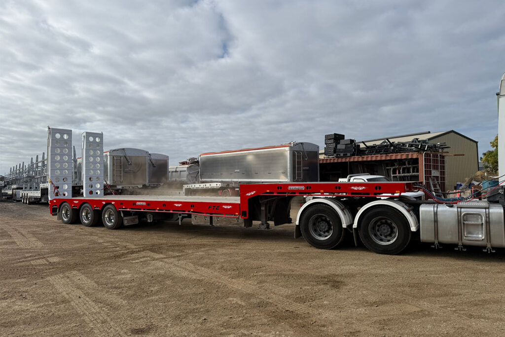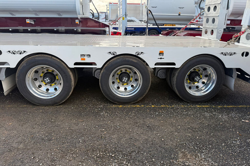 Heavy Duty, 3.5 m Hydraulic Widener , 3-way twist lock & container pins, 2 Toolboxes , Flip over Top deck Ramps, Gate Pockets, Alloy wheels , 20,000LBS Hydraulic Winch, Bi-Fold Ramps with single Beacon, Road Train Bracket, Airbag Suspension, K-Hitch Axles & K-Hitch Suspension, JOST or K-Hitch Landing Legs, EBS/ABS brakes, PBS compatible.