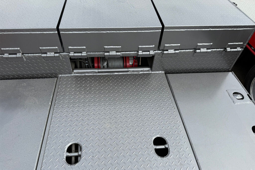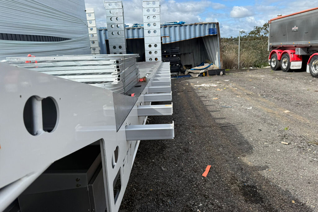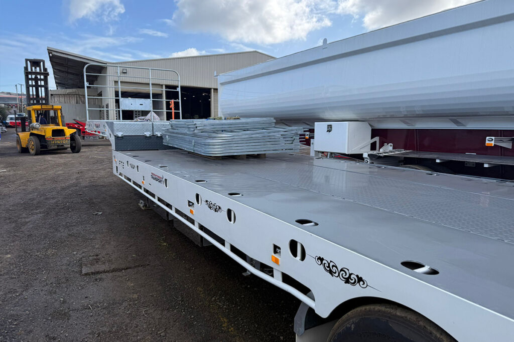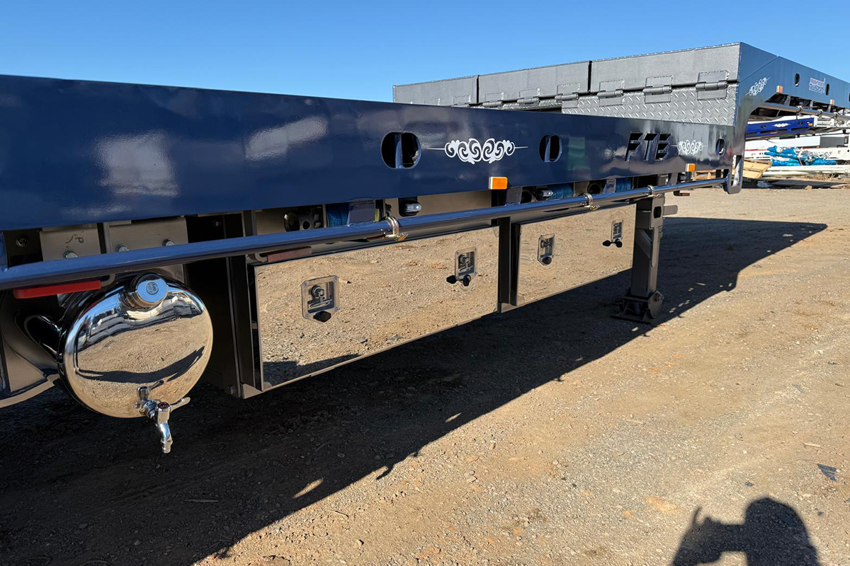 Ultra-Heavy Duty, 3-way twist lock & container pins, 4 Toolboxes, Flip over Top deck Ramps, Gate Pockets with Set of Gates, Alloy wheels , 20,000LBS Electric Winch, Bi-Fold Ramps with Double Beacon, Road Train Bracket, Airbag Suspension, K-Hitch Axles & K-Hitch Suspension, JOST or K-Hitch Landing Legs, EBS/ABS brakes, PBS compatible.