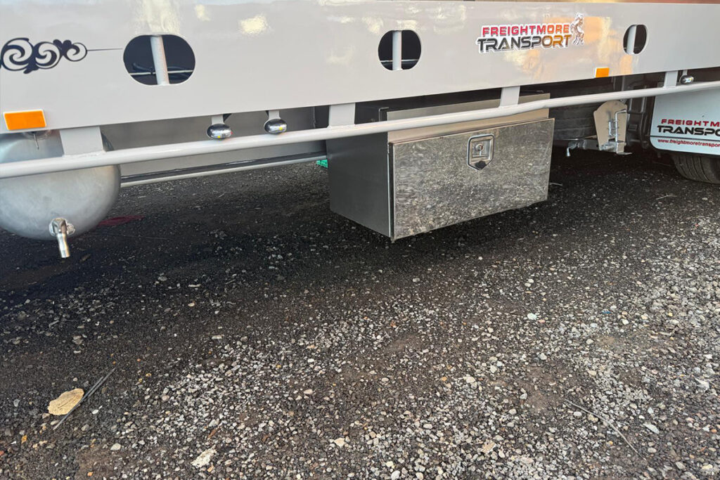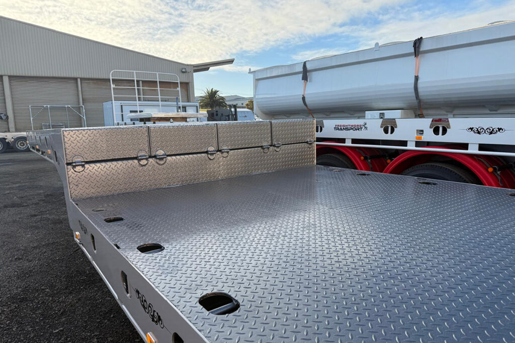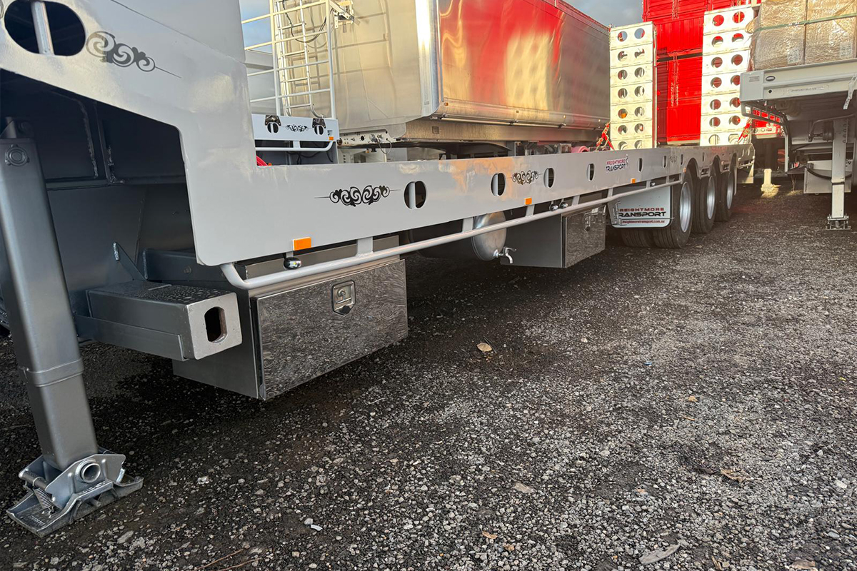 Heavy Duty, 3-way twist lock & container pins, 2 Toolboxes ( mirror finish lids), Flip over Top deck Ramps, Gate Pockets, Alloy wheels , 20,000LBS Electric Winch, Bi-Fold Ramps with single Beacon, Road Train Bracket, Spring Suspension ( Airbag Suspension Extra), K-Hitch Axles & K-Hitch Suspension, JOST or K-Hitch Landing Legs, EBS/ABS brakes, PBS compatible.
